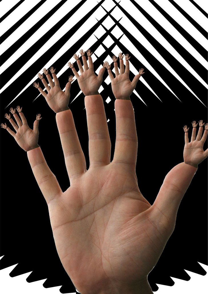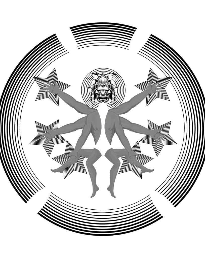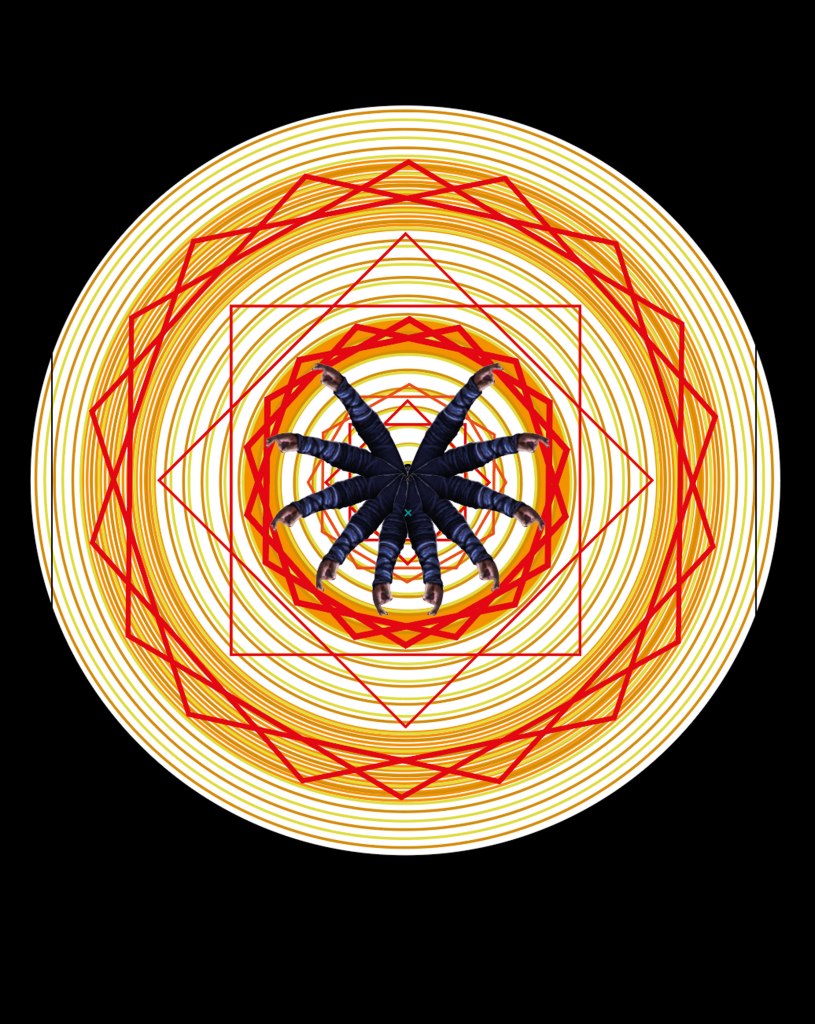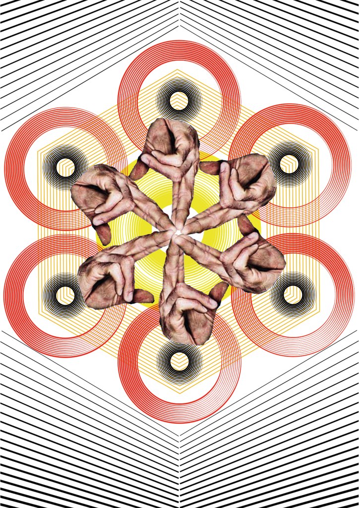 In Photoshop making Masks of Bodyparts. Creating samples with objects by transforming them using the adapttool in Illustrator. Later those masks of the bodyparts sampples where combined in one whole collage.